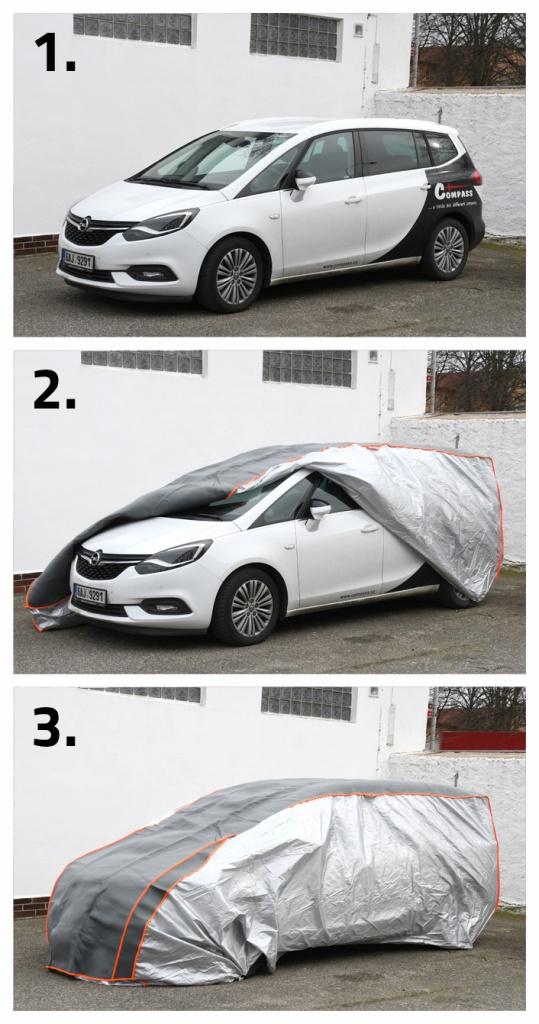 -jednoduché upevnění plachty - pouze se nasadí na automobil a ve spodní části s všitou gumou se přichytí za vhodné záhyby karoserie / nárazníku a přední i zadní část plachty se důkladně upevní pomocí všitých popruhů se sponami